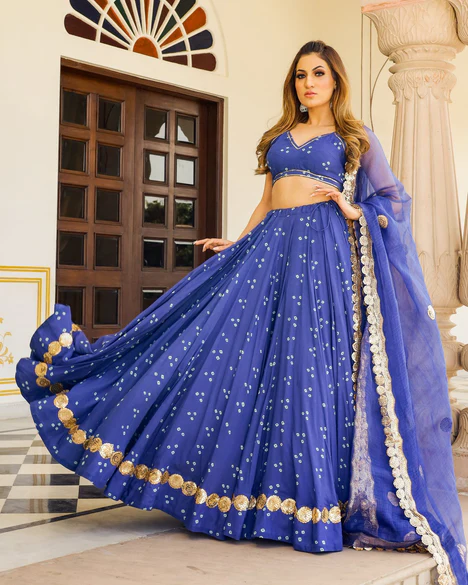 Embrace timeless elegance with our Blue Lehenga Set – a captivating ensemble designed to make you feel like a true diva. The padded choli features a stylish buttoned back, beautifully complementing the 42-inch lehenga adorned with full flair and shimmering sitara lace along the hem. Adding a touch of ethereal charm, the Kota silk dupatta is finished with delicate sitara lace edges and intricate floral accents.